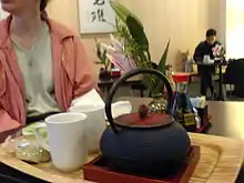 Tetsubin (鉄瓶) are Japanese cast-iron kettles with a pouring spout, a lid, and a handle crossing over the top, used for boiling and pouring hot water for drinking purposes, such as for making tea.