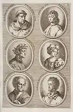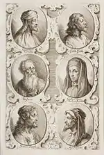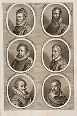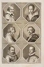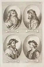 The German Academy of the Noble Arts of Architecture, Sculpture and Painting, or Teutsche Academie, refers to a comprehensive dictionary of art by Joachim von Sandrart published in the late 17th century. The first version was published in 1675 and it included a compilation of artist biographies that were later accompanied by illustrations by Richard Collin for a 1683 Latin edition by Christianus Rhodius. The list of portrait illustrations follows and is in page order. Most of the biographies were translated into German from earlier work by Karel van Mander and Cornelis de Bie, but Sandrart had travelled extensively in Europe and added many original biographies of German-born artists to his list. The illustrated portraits of artists born before his time were mostly based on 17th-century engravings by Hieronymus Cock and Jan Meyssens, many of which had also been re-published in De Bie's Het Gulden Cabinet.