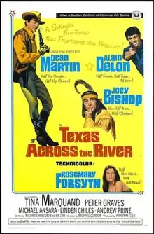 Texas Across The River is a 1966 American Techniscope comedy western film directed by Michael Gordon and starring Dean Martin, Alain Delon, Rosemary Forsyth and Joey Bishop.