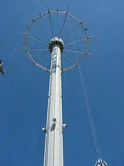 When Texas Chute Out opened on April 10, 1976, the ride was a major engineering innovation at the park dominating the entrance to the parking lot.[4] The ride was derived from the famed Parachute Jump ride at the legendary Coney Island in New York. Ride engineers from Intamin developed the ride, and then Six Flags purchased three Parachute Drop rides with two built at Six Flags Over Georgia and Six Flags Over Mid-America (now Six Flags St. Louis).