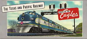 ![]() A Texas and Pacific EMD E7 leads an Eagle in this 1950s ticket cover. | |