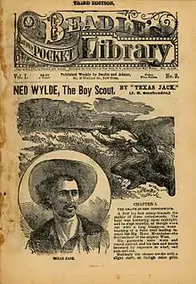 In the late 19th century, dime novels depicting frontier life were becoming common, and Texas Jack became a popular subject of these stories. The dime novels, printed on inexpensive wood pulp paper and costing five to ten cents each, were published weekly or monthly. One of the first of these novels was titled Texas Jack; or The White King of the Pawnees, written by Ned Buntline, and first appeared in 1872. Texas Jack's popularity grew as he was featured on covers by publishers including Beadle's New York Dime Library, the Nickle Library, Log Cabin Library, DeWitt's Ten Cent, Street and Smith, and others. Many of these stories were written by the prolific author Prentiss Ingraham. Omohundro wrote articles in newspapers across the country recalling his hunting and scouting stories, and is credited as having authored one dime novel titled Ned Wylde, the Boy Scout for Beadle and Adams in 1876.[16]