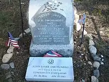 After several years, the grave fell into disrepair, and a traveling group of comedians raised funds to provide for its upkeep.[27] In 1908, while passing through Leadville, Cody visited the cemetery and commissioned a granite grave marker for his old friend, mistakenly listing Texas Jack's age as 39 years.[28]