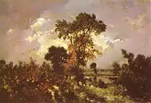 Until this period Rousseau had lived only occasionally at Barbizon, but in 1848 he took up his residence in the forest village, and spent most of his remaining days in the vicinity. He was now able to obtain fair sums for his pictures (but only about one-tenth of their value thirty years after his death), and the number of his admirers increased. He was still ignored by the authorities, even while his mentee Narcisse Virgilio Diaz was made Chevalier of the Legion of Honour in 1851.[2] Rousseau was left undecorated, but was nominated and awarded the Cross soon afterwards. He would eventually become an Officer of the Legion of Honor.[1]