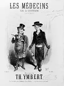 Théodore Ymbert was the son of the dramatist Jean-Gilbert Ymbert, who also practised as a legal administrator.[2] Following in the family profession of law, he also studied composition under Auguste Barbereau.[3] His musical activity in Paris over the years 1858 – 69 consisted for the most part in settings for voice.[4] Two works were his most successful: the music for the one-act comic opera Les Deux Cadis (1861);[5] and his Sept Fables de la Fontaine, which was preferred to Jacques Offenbach’s settings of La Fontaine's Fables when it was first performed in 1862,[6] and which continues to be performed.[7]