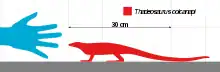 Thadeosaurus was a lizard-like animal, with a remarkably long tail that comprised about two thirds of the animal's total length of 60 centimetres (24 in). It also had long toes, especially on the hind legs, which would have given it a powerful stride, since the toes would still touch the ground while the foot was being raised. Combined with a strong breast bone to increase the strength in the forelimbs, this means that Thadeosaurus was probably a good runner.[2]