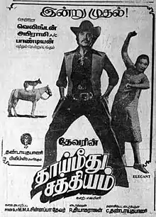 In the late 1960s, Sandow M. M. A. Chinnappa Thevar had planned to produce a film starring M. G. Ramachandran, titled Marupiravi; however, Ramachandran was unwell at that time, as well as involved in a legal case, resulting in the film being shelved. Thevar later revived the film in the late 1970s with a new title, Thai Meethu Sathiyam, but as Ramachandran had retired from acting after becoming the chief minister of Tamil Nadu, Rajinikanth was instead cast.[5][6] The film, directed by R. Thyagarajan, was Rajinikanth's first film in the Western genre, and the plot took inspiration from several Curry Westerns starring Jaishankar.[3] It was the last film produced by Thevar to be released; he died on 8 September when the film was still in production.[7]