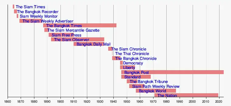 The Nation (Thailand)Bangkok WorldSiam Rath Weekly ReviewThe Bangkok TribuneStandard (Thailand)Bangkok PostLiberty (Thai newspaper)The Bangkok ChronicleThe Bangkok ChronicleThe Thai ChronicleThe Siam ChronicleBangkok Daily MailThe Siam ObserverSiam Free PressThe Siam Mercantile GazetteThe Bangkok TimesThe Siam Weekly AdvertiserSiam Weekly MonitorThe Bangkok RecorderThe Siam Times