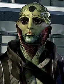 Thane was raised on the ocean planet of Kahje, the homeworld of the hanar, a species known for their strict adherence to polite speech and proper etiquette.[4] A few centuries before the events of the original Mass Effect trilogy, the hanar evacuated a portion of the drell species from their dying homeworld Rakhana and transported them to Kahje.[5] In gratitude to the hanar for saving them from extinction, the remnants of the drell people pledged their loyalty and service to the hanar as a client race, the two races establishing a symbiotic cultural relationship known as the Compact.[6][5] The drell are integrated into every level of hanar society and usually assist with many tasks the hanar may find physically difficult to perform even with mechanical aid, such as combat or assassinations.[6] The drell consider their service to the hanar an honor, regardless of the nature of the task.[7] Thane possesses eidetic memory, a genetic trait typical of the drell species. An external stimulus may trigger an involuntary memory recall, which are so vivid and detailed that some drell may mistake it for reality. Thane occasionally loses himself reliving the perfect recall of some of his memories and can describe them in flawless detail.[8]