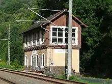 The station was equipped with an electronic interlocking in 2001. This resulted in the greatest changes to the station. Since then, it has had only had five through tracks, one island platform and a platform next to the station building. The two mechanical signal boxes were taken out of operation. The tracks in the station were completely destroyed by the Wild Weißeritz during the August 2002 floods, During the reconstruction, some buildings such as the W2 signal box, the track maintenance office and some workshops were demolished.[12] The entrance building has been empty since then and is in poor condition. The sale of the building, which was completed in 2013, has not changed this.[13] A large part of the historic buildings were integrated into the current railway operations and saved from demolition. The B1 signal box was demolished on 9 January 2016 and its site will be used by the cycle track being built between Hainsberg and Tharandt. During the preparations, the heritage protection of the building was lifted.[14]