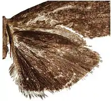 The length of the forewings is about 6 mm. The forewings are dark brown, irregularly and faintly mixed with specks of charcoal, rust and cream. There is an inconspicuous pair of tiny cream dots ringed with orange near the distal end of the discal cell, as well as a narrow cream irregular band extending along the termen. The hindwings are nearly uniform brown.