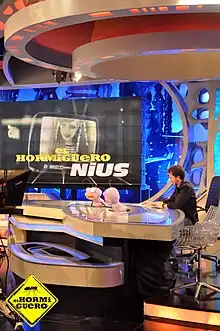 El Hormiguero (pronounced [el oɾmiˈɣeɾo]; Spanish for "The Anthill") is a Spanish television program with a live audience focusing on comedy, science, and guest interviews running since September 2006. It is hosted and produced by screenwriter Pablo Motos. The show aired on Spain's Cuatro channel from launch until June 2011 and is now broadcast on Antena 3.[1] Recurring guests on the show include Luis Piedrahita, Raquel Martos, Marrón & El Hombre de Negro ("The Man in Black"; the scientists), and puppet ants Trancas and Barrancas (from the Spanish expression a trancas y barrancas, which means "in fits and starts"). It has proved a ratings success, and has expanded from a weekly 120-minute show to a daily 40-minute show in its third season, which began on 17 September 2007.[2][3][4]