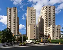 During the Great Depression, new buildings were added as a Works Progress Administration project secured by Mayor Frank Hague,[6] The Jersey City Medical Center included such architectural and designer trappings as marble walls, terrazzo floors, etched glass, decorative moldings and glittering chandeliers, and had one of the most famous maternity wards in the country – the Margaret Hague Maternity Hospital.[7]