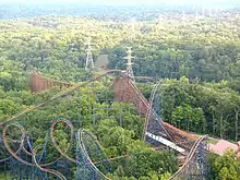 The track goes downhill, rises uphill, and then passes over a set of trim brakes before climbing the 107-foot (33 m) tall second lift hill.[37] At the top of this lift, the train turns left and begins a gradual, 18.5-degree drop.[10] During the descent, the track tilts to the left in preparation for the upcoming double helix that features a highly banked turn to the left. The drop itself measures 141 feet (43 m) from the crest of the lift hill to the lowest point of the helix. The signature double helix features two long tunnels and turns riders counterclockwise twice at very high speeds while ascending. After exiting this element, the train dips through another small hill into the final magnetic brake run and returns to the station.[34][38]