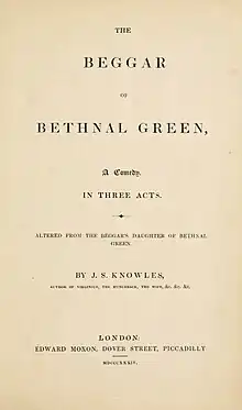 The Beggar's Daughter of Bethnal Green is a five-act comedy play by the Irish writer James Sheridan Knowles. It was first staged at the Theatre Royal, Drury Lane in 1828 in London. It takes its name from a traditional popular song of the same name. On its opening night the audience began heckling in the second act, and by the third act, their dissatisfaction had become so tumultuous that the stage manager "implored a patient hearing, pledging himself that if the opinion of the audience was so decidedly against the piece at its conclusion, it should be withdrawn".[1] The play was harshly criticised by the press for its weakness, lack of action, thinly sketched characters and lack of originality.[2] In 1834 a revised version entitled The Beggar of Bethnal Green was staged at the Victoria Theatre.[3] The action takes place in London and Romford, then in Essex.