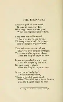 "The Beginnings" is a 1917 poem by the English writer Rudyard Kipling. The poem is about how the English people, although naturally peaceful, slowly become filled with a hate which will lead to the advent of a new epoch.
