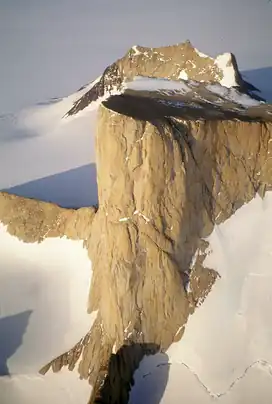 The Billboard is composed of Cretaceous Byrd Coast granite.[2] It is topped by an erosion surface that reaches an elevation of 793 metres (2,602 ft), which is about 700 metres (2,300 ft) above the outlet glacier below.[3] The surface lacks glacial erosion features; however erratics found on the surface provide evidence of overriding by cold-based glacier ice. Features of prolonged surface weathering in a sub-aerial environment are sheeting and weathering pits.[4][3]