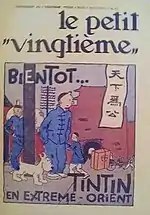 The comic strip began serialisation in Le Petit Vingtième on 9 August 1934 as Les Aventures De Tintin Reporter En Extrême-Orient (The Adventures of Tintin, Reporter in the Far East).[23] It began serialisation in France in Cœurs Vaillants from 29 December 1935,[24] and later in the Swiss magazine L'Écho Illustré.[25] Alongside protagonists Tintin and Snowy, Hergé also included the detectives Thomson and Thompson in the story, who had been introduced in the previous story.[26] He also alluded to the movie that Tintin and Snowy had interrupted the filming of in Cigars, Rastapopoulos' The Sheik's House, by having the characters watch the film during a cinema screening.[27]