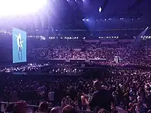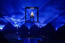 Other stage elements include a giant disco ball, a giant cube and a spinning carousel-like glass-window with large crucifixes depicting a chapel.[40][41][42][37] For the cube design, Madonna collaborated with game designer and artist Gabriel Massan inspired by her video "Bedtime Story" and Massan's dreamy landscapes. The cube is raised and projectors cover each side of the cube, with her movements recorded in real time.[43] Described as a "city of portraits",[36] the show have also several hanging retractable screens, and used the most amount of video in her touring career.[38][25] Speaking about the screens that came out constantly with projections on, according to Lipson, it allows singer's image and "key motifs" of her career to be "displayed to the entire crowd throughout the show".[35]
