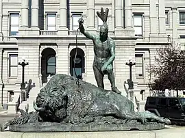 The Closing Era is a bronze sculpture of a Native American hunter standing over a dying bison, installed on the East side of the Colorado State Capitol in Denver.[1][2] The statute was created by Preston Powers, the son of famous sculptor Hiram Powers and "represents the end of the traditional lifestyle of Native Americans in Colorado".[3] It was originally created in 1893 for the World's Columbian Exposition in Chicago and subsequently donated to the state of Colorado and erected on a granite base. The base originated from Cotopaxi in Fremont County, Colorado. Powers commissioned a poem from John Greenleaf Whittier for the base of the statue.[3]