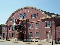 In November 1914, the new Coliseum was opened by owner Leo Kerker.[4] The new building is located across West Fourth Street from where the original Saengerfesthalle was located. It was designed by local architects Clausen & Burrows and constructed by local contractor Oelrich & Company.[5] The building has a steel frame covered with brick. It has an arched roof, and individual tiles across the top of the façade each have a letter that spells out the word “Coliseum”. The structure also features two-story corner pavilions and brick pilasters on the side elevations. A sign with the name “The Col Ballroom” hangs over the main entrance. The words are in the shape of a heart. In the early 1990s, the building was extensively renovated both inside and out. Ownership of The Col was passed to Don Wachel. The Quad Cities Mexican American Organization took over ownership in 1995.[4] The building has operated as a ballroom and concert venue ever since.[4][6] Lee Neece took over the ownership in 2014 and Leigh Macias Reitz in 2015.