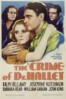 The Crime of Doctor Hallet is a 1938 American drama film, directed by S. Sylvan Simon and starring Ralph Bellamy, Josephine Hutchinson, William Gargan, Barbara Read, John 'Dusty' King, and Charles Stevens. The film was released by Universal Pictures on March 11, 1938.[2][3][4]
