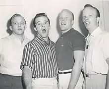 The boys sang on their father's radio shows and made a record with Bing on September 5, 1950[1] called "A Crosby Christmas" which charted at number 22 in the Billboard lists in December, 1950.[2] In 1958, the four brothers decided to form a vocal group called The Crosby Brothers.[3] They were featured on the cover of Life on September 15, 1958. An appearance on The Phil Silvers Show on November 14, 1958, followed, and they made their debut as a singing group at Tucson, Arizona, in 1959. Moving on to the Chez Paree, Chicago, in June 1959, they earned a good review from Variety which said "CROSBY BROS. Chez Paree, Chicago. Songs 58 Mins. Bing Crosby’s four sons are launched on the cabaret scene in high style. The frères - Gary, Phillip, Dennis and Lindsay - have a superlative act that is likely to abash those skeptics who surmised the boys would trade merely on the lustrous family name."[4] They continued to perform successfully at locations such as the Sahara in Las Vegas and the El Morocco nightclub in Montreal. However, after one of their performances at El Morocco in December 1959, the boys fought among themselves and Gary Crosby left the group.[5]