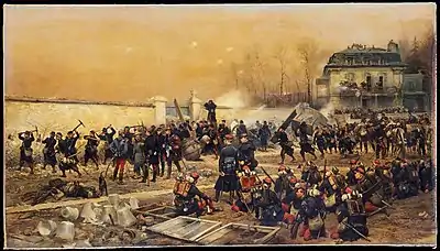 The Defense of Champigny depicts a scene from the Battle of Villiers (also referred to as the Battle of Champingny) during the Franco-Prussian War of 1870–1871. The battle was fought as part of a series of attempts by the French Army to disrupt the Prussian Army's siege of Paris. At Villiers, what the French intended to be a small reconnaissance sortie turned into a pitched battle with the Prussians; this fighting in turn caused thousands of casualties on both sides, the partial destruction of the villages of Villiers-sur-Marne and Champigny-sur-Marne, and the retreat of the French army to Paris.[1]