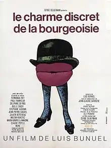 The Discreet Charm of the Bourgeoisie (French: Le Charme discret de la bourgeoisie) is a 1972 comedy-drama film directed by Luis Buñuel from a screenplay he co-wrote with Jean-Claude Carrière.[2] The narrative concerns a group of bourgeois people attempting—despite continual interruptions—to dine together. The French-language film stars Fernando Rey, Stéphane Audran, Jean-Pierre Cassel, Paul Frankeur, Delphine Seyrig, Bulle Ogier, Julien Bertheau, and Milena Vukotic.