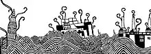 The Eraser cover art was created by Stanley Donwood, who also creates Radiohead's artwork. The cover, a linocut titled London Views, depicts a figure standing before London destroyed by flood in imitation of King Canute failing to command the ocean.[11] It was inspired by the 2004 Boscastle flood[20] and an article by environmentalist Jonathan Porritt comparing the British government's attitude to climate change to the Canute legend.[11]