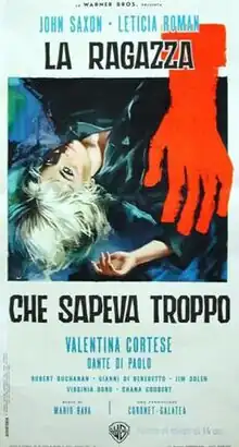 Letícia Román was cast in The Girl Who Knew Too Much; her first leading role.[12] Román knew actor John Saxon prior to production on the film.[13] Saxon has stated that he was invited by Roman to work on the film by asking if he would be interested in an art film in Rome.[13] Saxon agreed, but on receiving the script he found that he misunderstood her as she said horror film instead.[13][14][15] Dante DiPaolo stated that Bava initially thought DiPaolo was too young for his role in the film, but after seeing his screen test he felt DiPaolo understood his part well and cast him in this film and later again in Blood and Black Lace.[16] Film began with tentative title Incubo infuori programma with the planned English title being Incubus.[9]