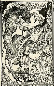 Petru fights the chimeric Welva in the wood. Illustration by H. Justice Ford (Violet Fairy Book).