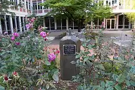 ![]() The pedestal for James Lee Hansen's The Falconer (1973) in the courtyard of Prince Lucien Campbell Hall in 2013. The piece was stolen in 2008. | |