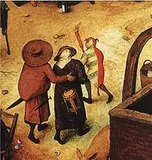 The spectacle is divided into two halves, and framed by two buildings: the inn on the left, the church on the right, which gives it the character of a scene in a stage show.[6] The left side of the sprawling canvas depicts the Carnival, the right side, Lent. The boundary is not sharply defined, however, and in several places the followers of Lent and Shrove Tuesday invade each other's space. The painting depicts different times of year. Barren, wintery, trees on the left hint at the winter, while the budding trees of the churchyard's lenten side hint at a burgeoning spring.[7]