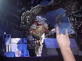 The walk-on Eddie, a regular fixture of the band's tours, appeared in his new incarnation as an extraterrestrial. Complete with an "Ed-cam" (a point of view camera which fed directly to the projector screens), the new Eddie was smaller than those of previous tours, and was the first to appear with a guitar on stage. Eddie broke his guitar in Valencia, the last date of the 2010 tour, during the song "Iron Maiden", although it was replaced in 2011.[45] In São Paulo, Rio de Janeiro, Buenos Aires, Santiago and throughout the second European leg a giant Eddie was used during "Iron Maiden", appearing at the back of the set with flashing eyes and hands gripping either side of the rear walkway (the walk-on Eddie, from that point, being used during "The Evil That Men Do").[46]