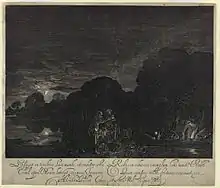 The Flight into Egypt is an oil-on-copper cabinet painting by the German artist Adam Elsheimer dating from about 1609, while he was in Rome. It is thought to be the first naturalistic rendering of the night sky in Renaissance art.[1] At Elsheimer's death in Rome in 1610, this picture was hanging in his bedroom.[2] Like many other artists before and after him, Elsheimer has depicted the biblical Flight into Egypt, in which Joseph, Mary, and Jesus seek refuge from possible persecution by Herod. For its innovative fusing of religious and landscape elements, and its detailed juxtaposition of light and darkness, The Flight into Egypt is one of Elsheimer's most well-known and lauded works. It is also likely his last painting, for he died a year later.