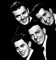 They did have two hit singles in the United States in the late 1950s, both on Paris Records.[1] The first, "Love Me Forever", featured orchestral backing by Sid Bass with vocal enhancement from a female session vocalist, and peaked at No. 25 on the Billboard Hot 100 in 1957.[2] It also reached No. 23 on the UK Singles Chart.[3] In the US, Eydie Gormé's cover charted higher, whilst in the UK it was outsold by Marion Ryan's version.[1] The Four Esquires second hit, "Hideaway", had orchestral accompaniment by Richard Hayman, and peaked at No. 21 in the US in 1958.[2]