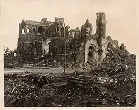 The statue became a symbol to both British and German troops; soldiers remarked the Virgin Mary was keeping the baby Christ from falling.[14] On 27 March 1918, The Golden Virgin was at the center of fighting. During the night an intense moonlit battlefield allowed the Germans to target British troops and target the sculpture.[15] German troops occupied the city of Albert in 1918 and the British shelled the Basilique in order to deprive the Germans of the elevated position, and the statue was toppled. It was never recovered.[1][12] By 28 September 1918, the sculpture was reported to have fallen and only partial walls of the Basilica were left standing. German troops had destroyed the building including the basement. German troops also set clockwork bombs which were timed to explode three weeks after they left.[16] Coincidentally, World War I ended 11 November 1918.[17]