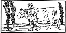 After three days the peasant had not received his money. "I trusted that dog to keep the bargain", he said to himself bitterly. Storming into town he went straight to the butcher and demanded payment for the meat. The butcher thought the peasant was joking, but the peasant insisted he wanted payment for the meat he had left in the custody of the butcher's dog. Instead the butcher seized his broom and chased the peasant out of his shop.[1][2]
