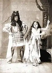 Mr. and Mrs. Carte hired a new soprano, the Hungarian Ilka Pálmay, who had recently arrived in England and quickly made a favourable impression on London audiences and critics with her charming personality.[15] Gilbert devised a new plot line revolving around Pálmay, making her character, Julia, an English actress among a company of German actors, with the topsy-turvy conceit that her "strong English accent" was forgiven by her audiences because of her great dramatic artistry. Rutland Barrington's role, Ludwig, became the leading comedian of the theatrical company and the central role in the opera.[16] Gilbert had paired the title character with contralto Rosina Brandram, causing Sullivan to suggest some different pairings of the characters, but Gilbert and the Cartes disagreed; Mrs. Carte went so far as to caution Sullivan that his ideas would upset the casting.[17] Unhappily for Gilbert, three of his usual principal players, George Grossmith, Richard Temple and Jessie Bond, who he had originally thought would play the title character, the prince and the princess, all left the company before rehearsals began for The Grand Duke, and so he reduced the size of these roles, further changing his original conception.[18]