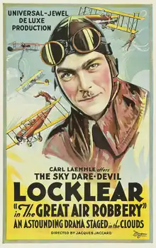The Great Air Robbery (aka Cassidy of the Air Lanes) is a six-reel silent 1919 American drama film directed by Jacques Jaccard and produced by Universal Pictures. The film stars Ormer Locklear, Allan Forrest and Ray Ripley. The Great Air Robbery is a film that showcases the talents of stunt pilot Locklear, considered the foremost "aviation stunt man in the world", and depicts pilots flying air mail, the first film to deal with the subject.[2] There are no known archival holdings of the film, so it is presumably a lost film.[3]