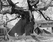 Cherry's choice specifically of a Kapok tree (genus Ceiba) as a symbol to represent the need for forest conservation worldwide is particularly appropriate. Kapok trees, with their imposing height and girth (some species can grow to over 73 m (240 ft) in height and up to 5.8 m (19 ft) in diameter), feature largely in Native American mythologies (particularly that of the Maya) as embodiments of the Axis mundi, sustaining the entire cosmos by linking heaven, earth and the underworld (compare the mythical ash tree Yggdrasil).[3] The compassionate woodman who decides to spare a single tree can thus be understood as standing for a decision by the human race to refrain from destroying the natural world in order to preserve it for future generations.[4][5]