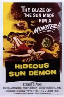 Development for The Hideous Sun Demon began after the 1957 release of The Astounding She-Monster, a science fiction film starring Clarke. In his contract for the film, Clarke was promised five percent of She-Monster's profits in addition to his salary. Although Clarke later admitted that the film was poorly made, it was a financial success, with Clarke receiving a sizable sum from the film's box office returns.[1][2] Inspired by that film's financial success, Clarke decided to direct his own low-budget science fiction film.[2] According to Clarke, the story for the film was inspired by Robert Louis Stevenson's The Strange Case of Dr Jekyll and Mr Hyde, which dealt with multiple personalities.[2] Clarke and co-writer/director Tom Boutross wrote the first draft of the screenplay (although some sources, including Clarke himself, say his friend Phil Hiner co-wrote the first draft),[1][3] then-titled Saurus or Sauros, names taken from the Latin word meaning "reptile".[1][2][4][5] Other working titles for the film included Strange Pursuit and Terror in the Sun. Boutross, who is also credited as one of the film's co-directors, later edited films like Rat Fink (1965), A Man Called Dagger (1967) and 1974 hit The Legend of Boggy Creek.[6] The first draft of the script was significantly different from what would be shown in the finished film. The original storyline centered on an explorer and a female lawyer searching for uranium in the country of Guatemala. While there, they are tormented by a man who had been mutated by experiments conducted on him by his scientist father, who is an expert in radiation, and when the young man is exposed to the sun, he transforms into a reptilian creature.[1]