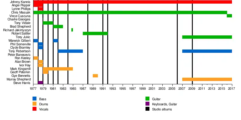 • Johnny Kannis (1977–84, 1989–92): Holmgren, Magnus. "Johnny Kannis". hem.passagen.se. Australian Rock Database (Magnus Holmgren). Archived from the original on 3 March 2004. Retrieved 23 June 2017.