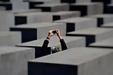 Some visitors take selfies at Holocaust memorials, which has been the subject of controversy. In 2018, Rhian Sugden, a British model, received criticism after posting a selfie at the Memorial to the Murdered Jews of Europe in Berlin with the caption "ET phone home". She later removed the caption but defended taking the photograph.[3] Other celebrities have also been criticised for photographs at the Berlin memorial, including Indian actress Priyanka Chopra[4] and US politician Pete Buttigieg, whose husband posted a photograph of him at the memorial on a personal social media account.[5]