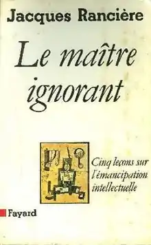 The Ignorant Schoolmaster: Five Lessons in Intellectual Emancipation[1] is a 1987 book by philosopher Jacques Rancière on the role of the teacher and individual towards individual liberation. Rancière uses the example of Joseph Jacotot, a French teacher in the late 18th century who taught in Belgium without knowledge of their language (Flemish), to explain the role of liberation after Marxism. The work expresses Rousseauist ideas, e.g. in the state of nature humans are morally good, and emphasizes that individual change precipitates societal change. Its arguments draw heavily from the French socialist party's debates on education during the 1980s. It was translated to English in 1991 by Kristin Ross.