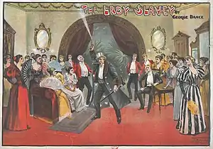The Lady Slavey had a run of less than a week at the Lafayette Square Opera House in Washington D.C. before George Lederer's production opened at the Casino Theatre on Broadway on 3 February 1896[6] where it ran for 128 performances. Lederer instructed Dance to "Americanize" the piece and it was put on with new lyrics by Hugh Morton and a score by Gustave Adolph Kerker.[6][7] The lazy Sheriff Dan Daly is set the task of reclaiming the estate of a bankrupt Englishman. In an attempt to stave off financial ruin the Englishman tries to marry off his daughter, the slavey of the title (Virginia Earle) to a wealthy young heir with the assistance of Flo Honeydew (Marie Dressler).[6]