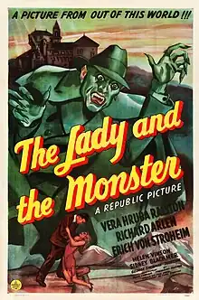 The Lady and the Monster is a 1944 American science fiction horror film directed by George Sherman, and starring Vera Ralston, Richard Arlen, and Erich von Stroheim.[1] The film is about the attempts to keep alive the brain of a multimillionaire after his death, only to create a telepathic monster. The man then takes over the medical assistant's mind, and the "lady" of the title has to fight it. The film's copyright was renewed in 1971, so it will enter the American public domain in 2040.[2]