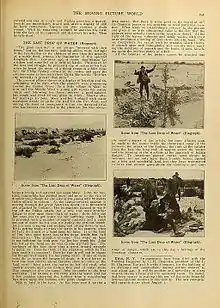 The Last Drop of Water was promoted as having "extras well above 200"[3] to show the detail and money going into the Western. The Biograph Company was heavily promoting the film at one of the highest state of production within the film industry of its day- trying to prove its modernity in the state of change within the film industry. This is considered to be Griffith's way of continuing his career since the Western by this time was losing popularity; this was his late break into the Western genre.[4] The title of the film changed from "In a Wagon Train Going Westward in the 1800s" but was changed prior to the film's release date. California had a variety of environments that were used within the film; it was starting to become popular with filmmakers because of the access to natural and various landscapes.[5]