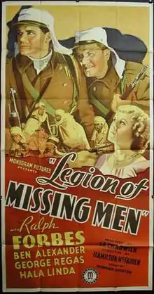 The Legion of Missing Men is a 1937 Monogram Pictures film about the French Foreign Legion set in the French protectorate of Morocco. Directed by Hamilton MacFadden, it stars Ralph Forbes who had also served in the cinematic Foreign Legion in Beau Geste (1926) and Beau Ideal (1931).[1] Singer and actress Hala Linda was married to Richard Gump, the composer of the film's "The Legionnaires Song".[2] It was the only film of Monogram's Marlene Dietrich imitator. The film features scenes reused from a silent film, presumably Under Two Flags.